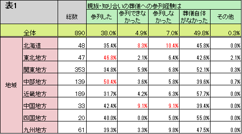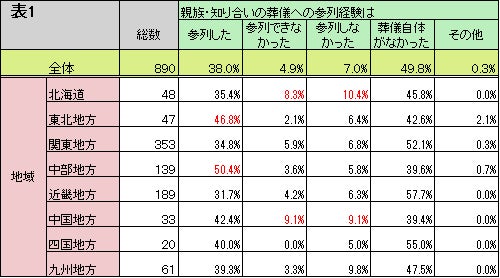 ・さらに、葬儀参列経験の有無を地域別にみてみると、表1の通り、「参列した」比率が高いのは「東北と中部地方」であり、「参列できなかった・しなかった」と回答した比率が高いのは「北海道・中国地方」となっている