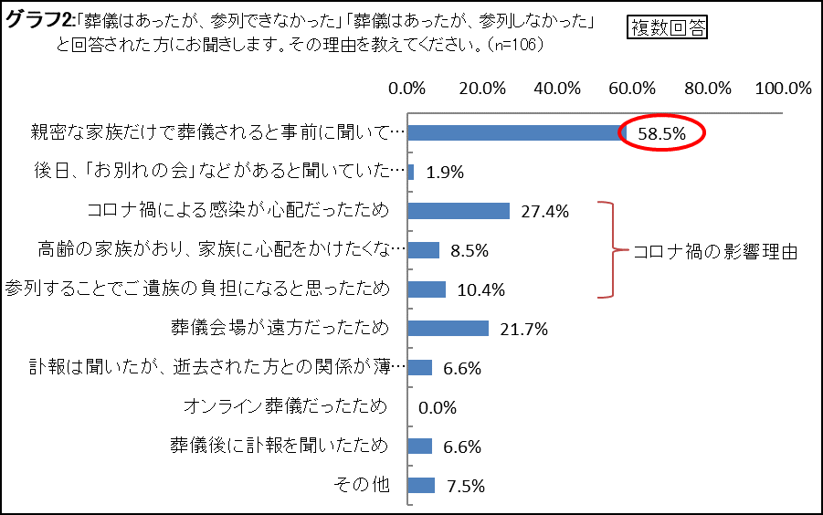 ・上記のうち、「葬儀はあったが参列しなかった・できなかった」と回答された106名の方にその理由を聞いたところ、グラフ2の通り、「親密な家族だけで葬儀をされると聞いたため」との回答が最も多かった(58.5%)が、一方でコロナ禍での影響と思える理由も幾つか認められた