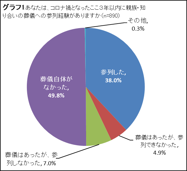 ・喪主等以外の方にコロナ禍の3年間における「葬儀への参列経験の有無」を聞いたところ、グラフ1の通り、「葬儀自体がなかった方」が49.8%、「葬儀参列経験ありの方」が38.0%となった