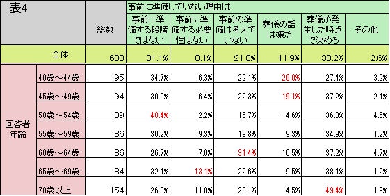 これを、回答者の年齢で関係をみてみると、表4の通り、40歳代では「葬儀の話は嫌だ」が、50歳代前半では「事前に準備する段階ではない」が、60歳代前半では「事前の準備は考えていない」、同後半では「事前準備する必要はない」が、70歳以上では「葬儀が発生した時点で決める」が各々平均値より比較的高い回答比率となっている