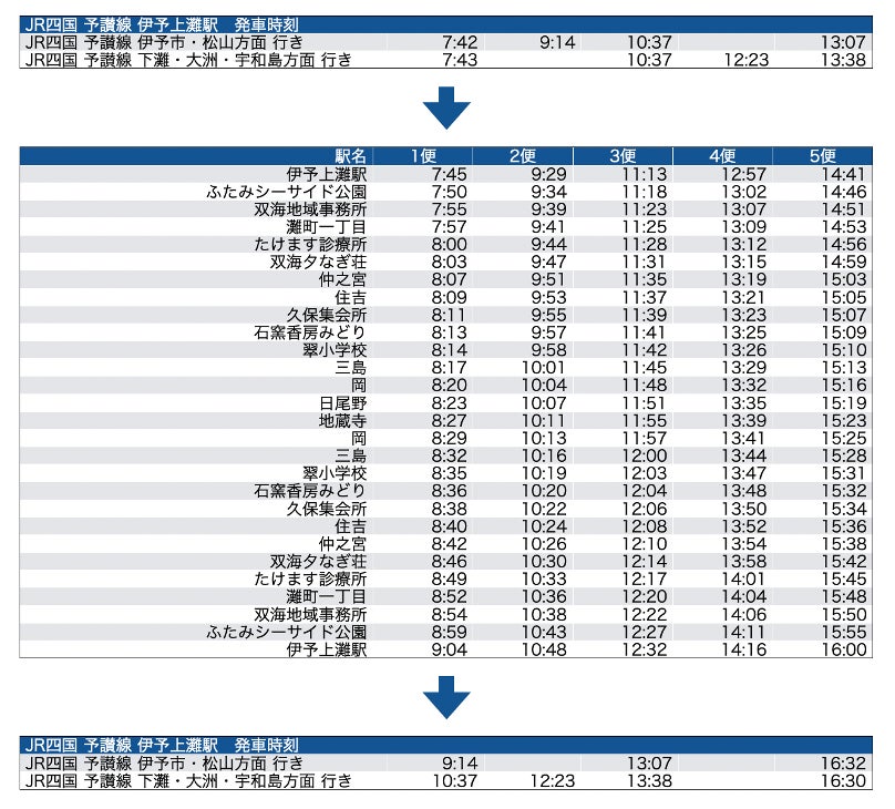 本実証では、2022年度の実証実験の運行ルートより、翠小学校から日尾野までの約1.8kmの区間を延伸することで、より幅広い地域に住む方々が気軽に乗車できるようにします。また、2022年度の実証実験の際に多くの要望があった「鉄道との乗り継ぎ」を円滑にするため、JR伊予上灘駅において鉄道との乗り継ぎを考慮した運行ダイヤを設定する他、通勤や通学に利用できるよう早朝から運行します。また、校区外から鉄道を利用して翠小学校へ通学している児童向けに、通学時間に合わせてJR伊予上灘駅から翠小学校までを直接結ぶ特別便を運行し、双海地域の住民の生活に寄り添った公共交通サービスの実現を目指します。