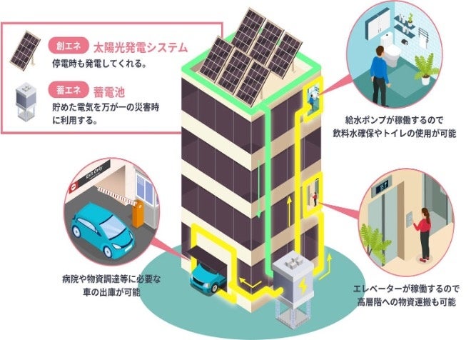 ・内容:マンションに設置した太陽光発電システムと蓄電池の活用により、災害時におけるマンション住民の生活維持を支援するだけでなく、再エネの活用によって、マンション1棟を脱炭素化することができるサービスです。