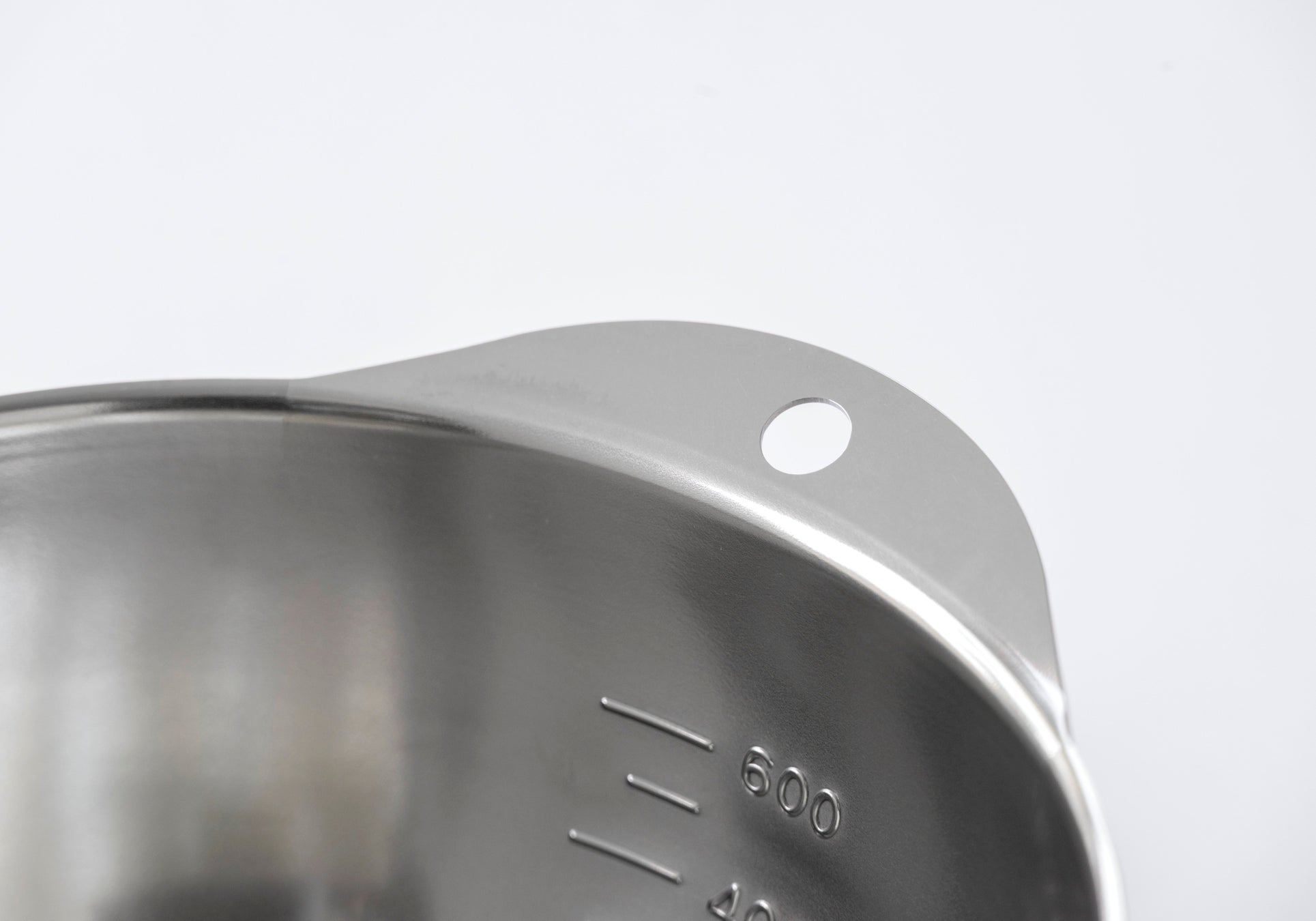 親指を添えられる縁は、角度や使いやすさ、持ちやすさにこだわった設計。手にしっくり馴染み、調理中もボウルをしっかり支えることができます。液体を注ぐ際は、縁の穴に親指を置くことでさらに安定感が増し、狙った場所にスムーズに注げます。