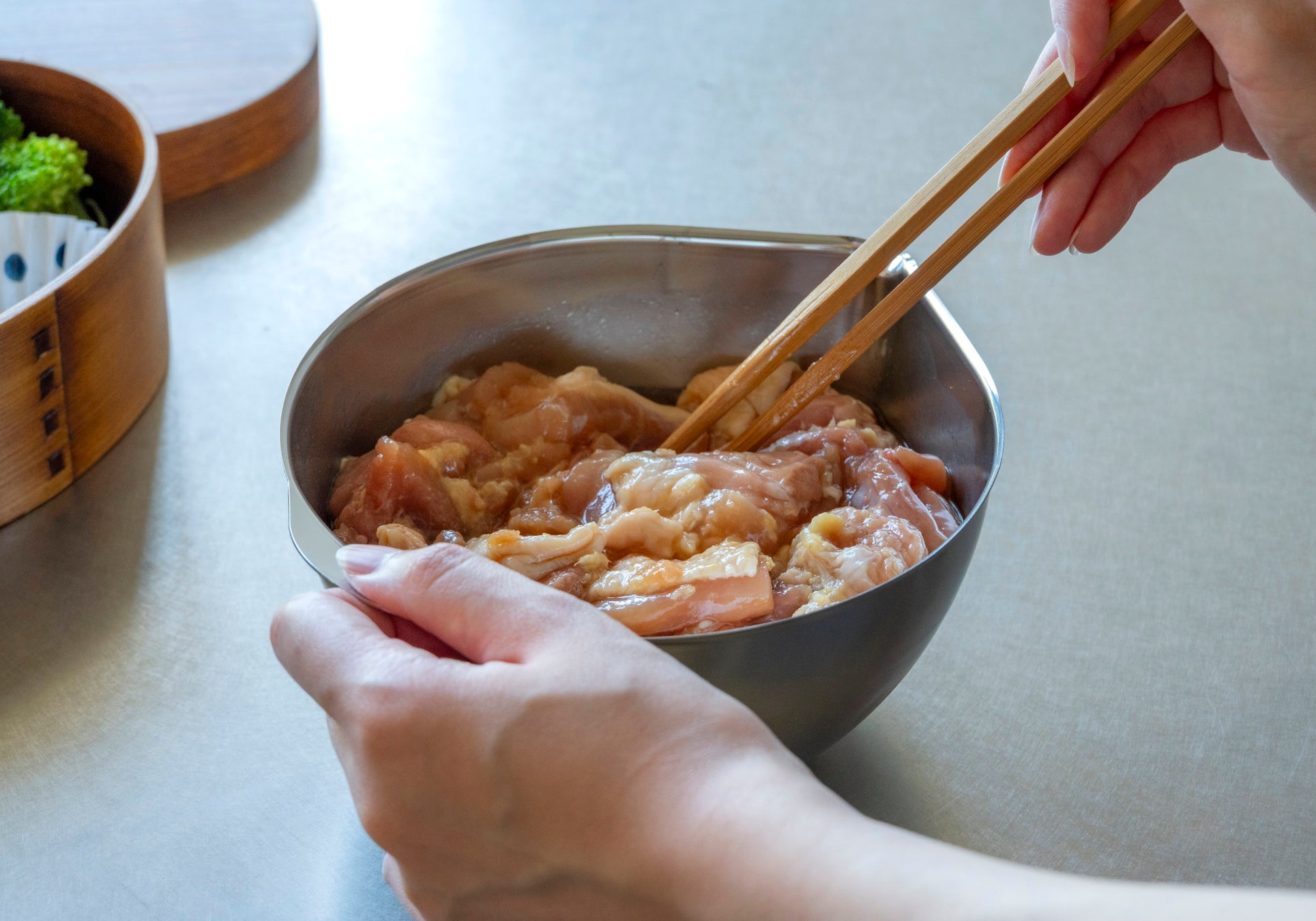 また、ボウル外側はラップがピタッと密着しやすい、なめらかな光沢仕上げ。ラップがしっかり張り付くので、下ごしらえ後に冷蔵庫で休ませるのにも便利。