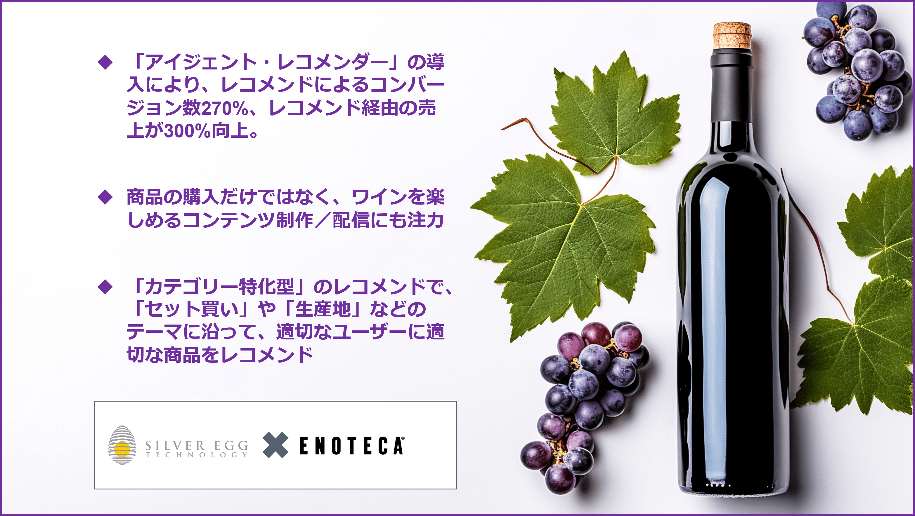 シルバーエッグ・テクノロジー株式会社(本社:大阪府吹田市、代表取締役社長&CEO:トーマス・フォーリー、証券コード 3961、以下 シルバーエッグ)は、同社が開発・提供するAI技術を用いたリアルタイム・レコメンドサービス「アイジェント・レコメンダー」およびリアルタイム・レコメンドメールサービス「レコガゾウ」をエノテカ株式会社(本社:東京都港区、代表取締役社長:堀 慎二、以下 エノテカ)が運営するECサイト「エノテカ・オンライン」(https://www.enoteca.co.jp/)に導入しました。これにより、レコメンドによるコンバージョン数が前年(2022年)と比較して270%、レコメンド経由の売上が300%向上するという成果を確認したことを発表いたします。