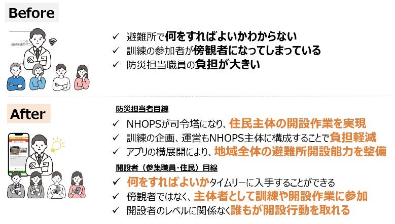「NHOPS」は自治体の防災担当職員や避難所開設者(参集職員や住民)が直面する課題を解決し、『住民主体の避難所開設・運営』をサポートします。