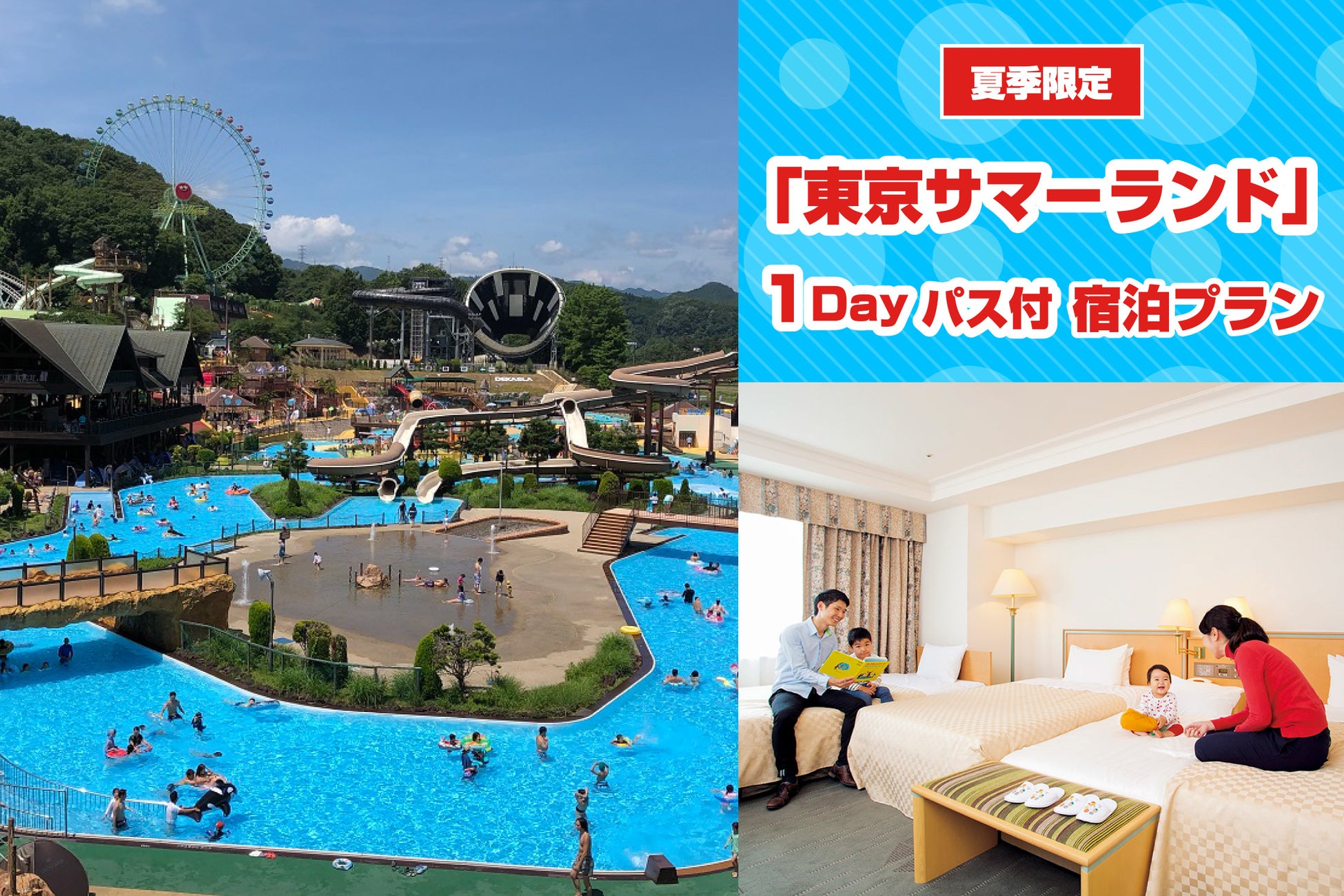 ホテルから車で約25分の距離に位置する「東京サマーランド」は、小さなお子様から大人まで、ご家族みんなで楽しめる屋内プールエリア(アドベンチャードーム)や、“のんびり系”から“絶叫系”まで幅広いアトラクションを楽しめる屋外遊園地(スリルマウンテン)、夏季には日本最大級の流れるプールや多彩なウォータースライダーなど“水の冒険”が楽しめる屋外プールエリア(アドベンチャーラグーン)を含め3つのエリアをお楽しみいただけます。また滞在中のお部屋タイプはシングル、ツイン、ダブルなどシーンに応じて全部屋タイプからお選びいただけるほか、スタンダードツインでは、ベッドをつなげ1つの大きなベッドに対応も可能なことから、小さなお子様の添い寝でも安心して快適にご利用いただけます。