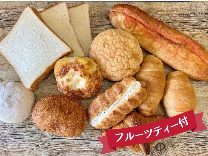 全10個程度のパン(志免ロン・カレーパン・北の大地あんパン・明太フルート等お店おまかせの内容)、国産果実のフルーツティー ローゼル1袋