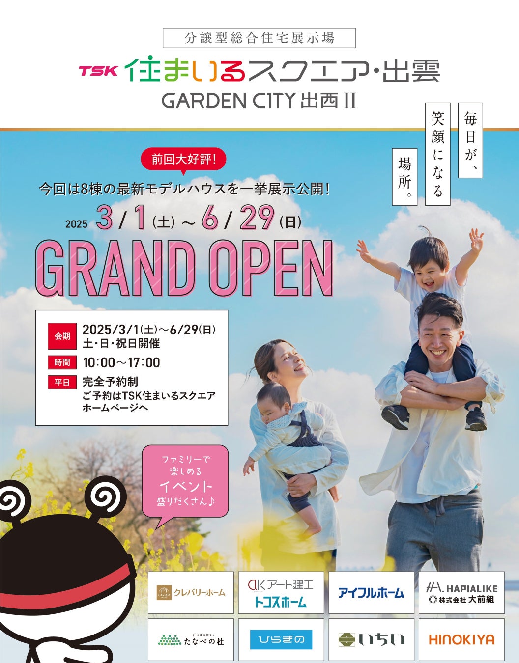 2025年3月1日(土)島根県出雲市の人気カルチャーエリア【出西】で、地元テレビ局であるTSKさんいん中央テレビ主催の住宅展示場『TSK住まいるスクエア・出雲ガーデンシティ出西Ⅱ』がグランドオープン