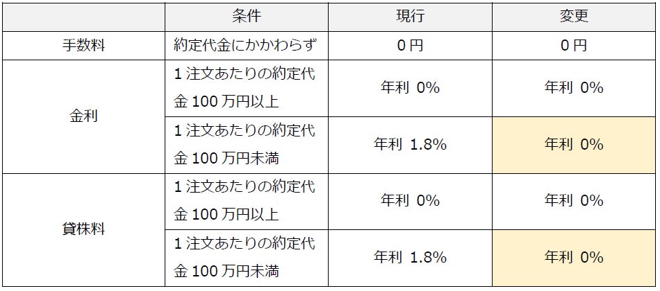 これまで買方金利・貸株料は1約定あたりの約定金額が100万円未満の場合は1.8%としていましたが、2024年6月3日(予定)より無料とします。