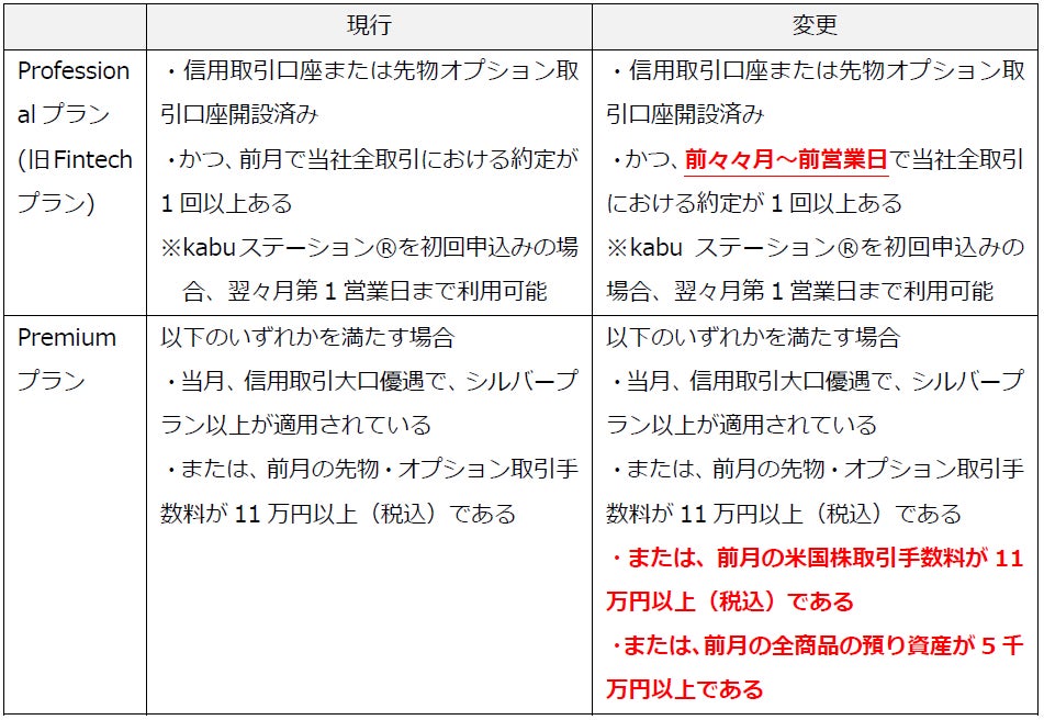 FintechプランをProfessionalプランと改称し、下表のとおり、各プランの適用条件を緩和します。また、フル板、デイトレ板及びチャートの機能を改善します。