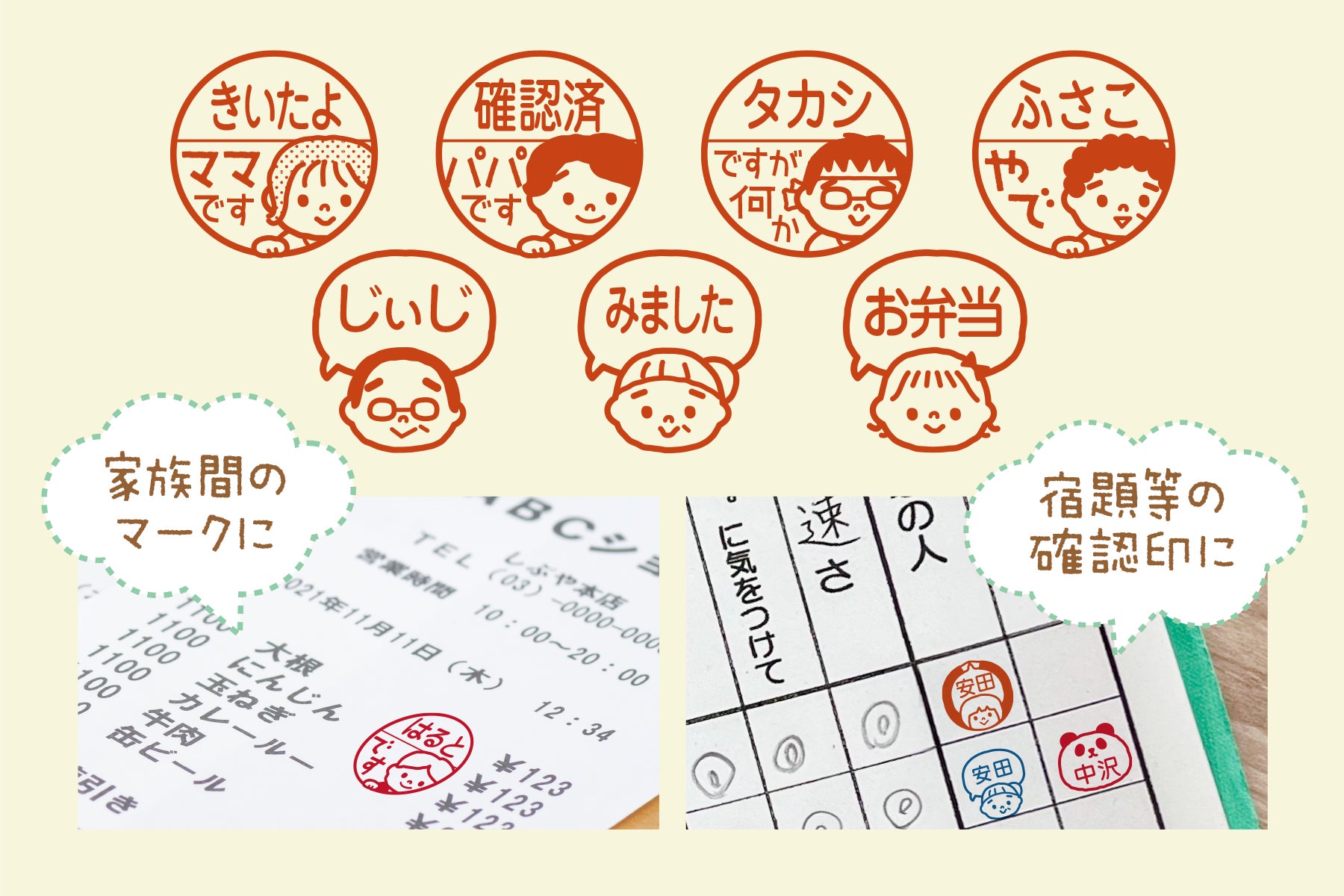 スケジュール帳や、回覧板のサイン、オフィスでのチェック印などにお使いいただけるキャップレス印鑑です。顔入りは、家族間のマークや家族カレンダーなどにもご活用いただけます。お子さまの宿題サインとして「みましたスタンプ」としてもオススメです。