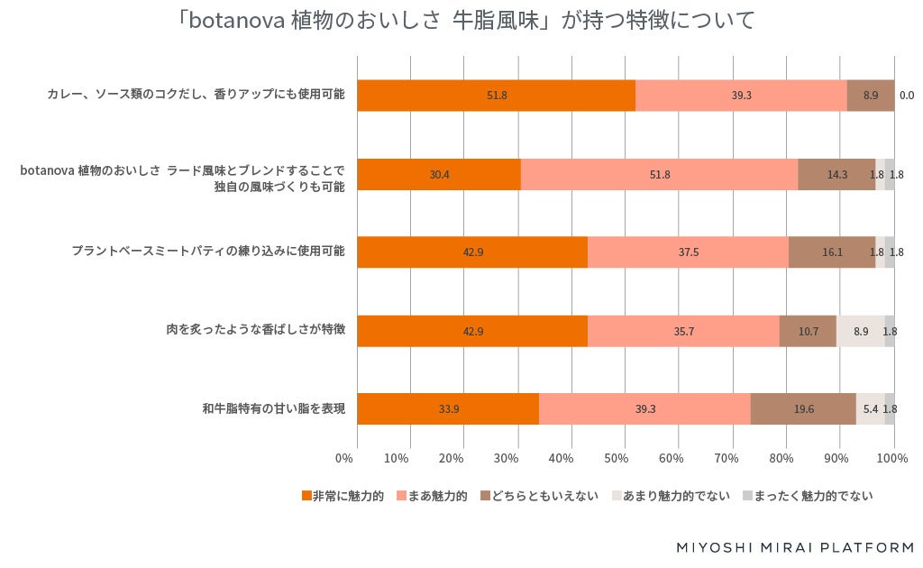 ・「botanova 植物のおいしさ 牛脂風味(※5)」の魅力度第1位は、「カレー、ソース類のコク出し、香りアップにも使用可能」。香りやうま味などのおいしさが高評価で、使用することで素材が生きる、素材を引き立たせるという声が多い。