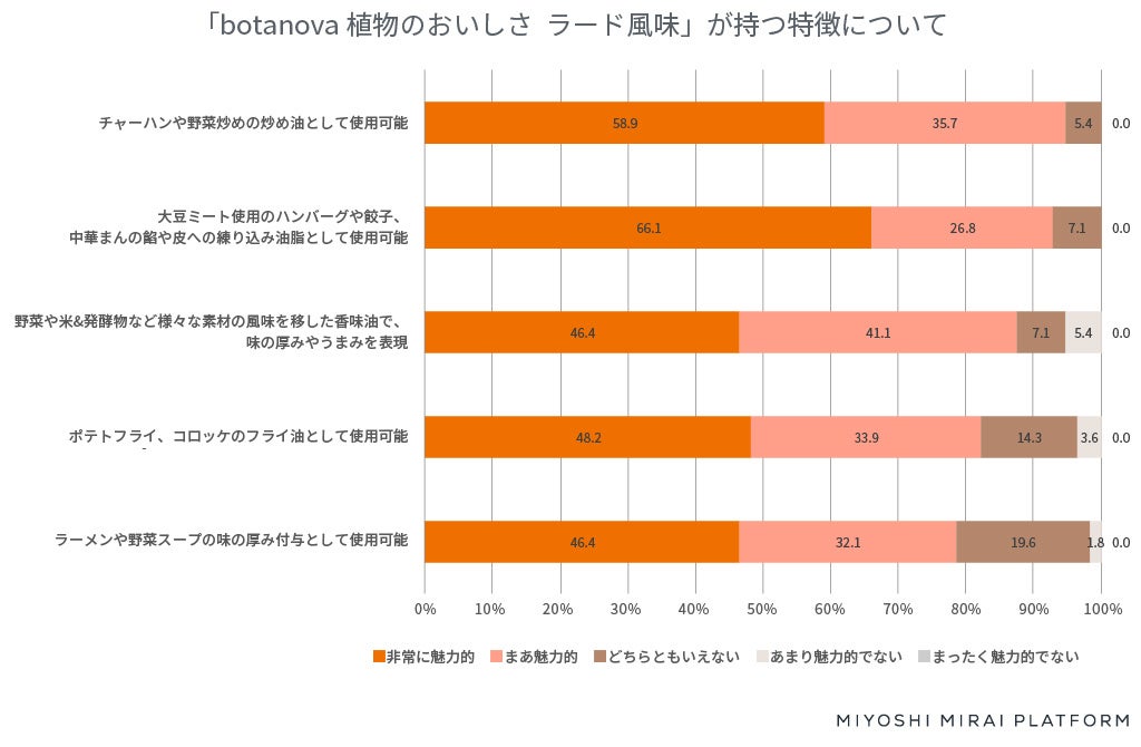 ・「botanova 植物のおいしさ ラード風味(※4)」の魅力度第1位は、「チャーハンや野菜炒めの炒め油として使用可能」。いろいろな料理、シーンで使える汎用性の高さも高評価で、特にラードが欠かせない中華での需要が高い。