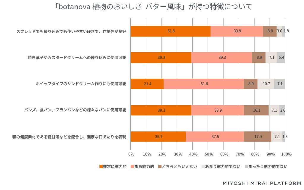 ・「botanova 植物のおいしさ バター風味(※2)」の魅力度第1位(※3)は、「スプレッドでも練りこみでも使いやすい硬さで、作業性が良好」。味だけでなく物性や機能面でもバターの代用品として期待値が高く、菓子用途での需要が高い。