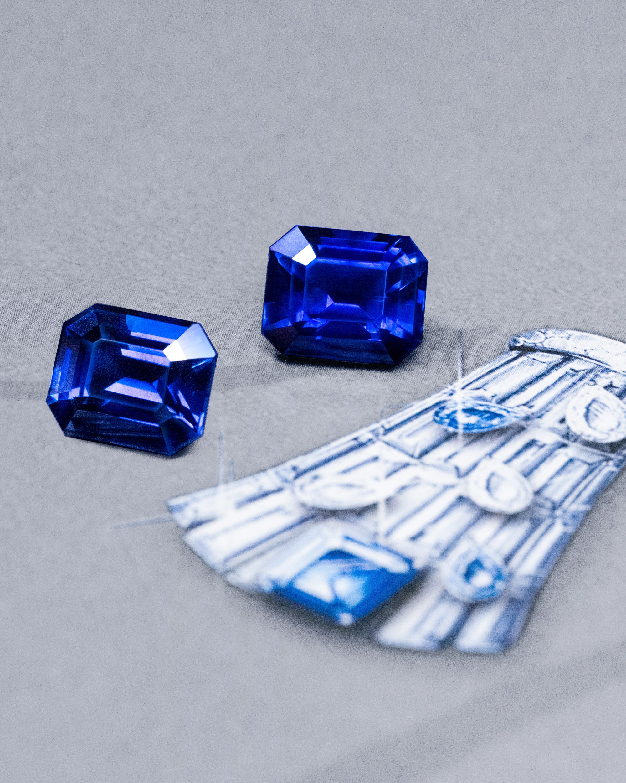 セットのイヤリングは、エメラルドカット&ペアシェイプ ダイヤモンドとペアシェイプ サファイアが煌めきのカスケードを描き、鮮やかな存在感を放つ5カラット エメラルドカット サファイアがセンターを彩ります。それぞれのクリエイションは、眩い輝きと躍動感を生み出す卓越した技巧により、煌めきが流麗に連なる美しいフォルムを描き出しています。