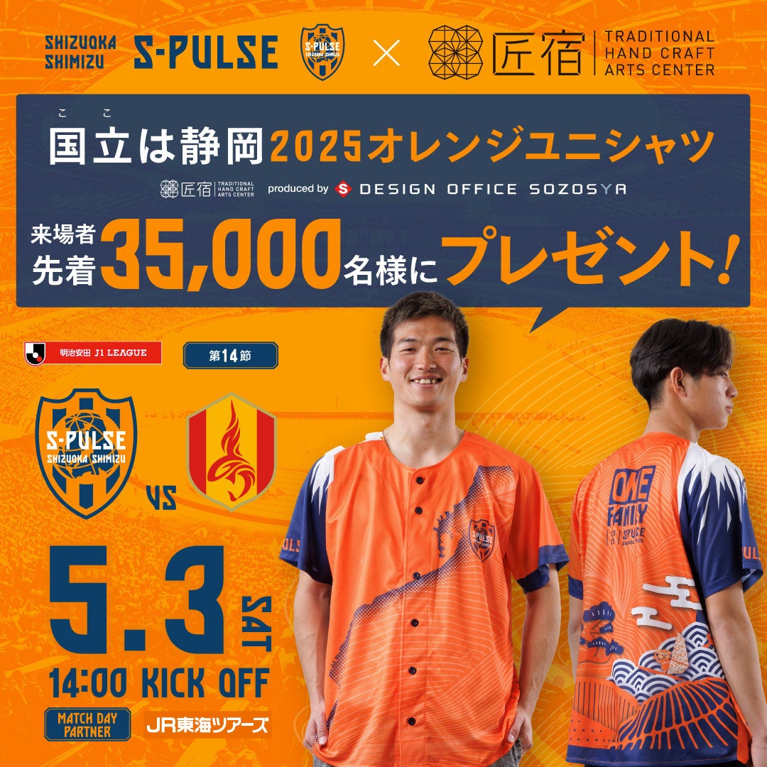 匠宿が、2025明治安田J1リーグ第14節名古屋グランパス戦でエスパルスサポーターご来場先着35,000名様にプレゼントされる「国立(ここ)は静岡 2025 オレンジユニシャツ」のデザインを制作。
