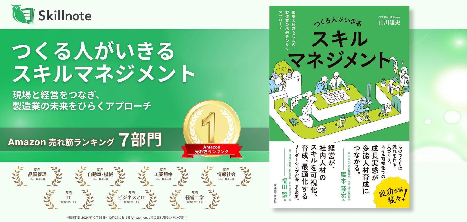 製造業のスキルマネジメントを牽引する株式会社Skillnote(本社 東京都千代田区、代表取締役 山川隆史、以下Skillnote)は、10月30日(水)に発売した代表・山川の著書、『つくる人がいきるスキルマネジメント〜現場と経営をつなぎ、製造業の未来をひらくアプローチ〜』が、丸善・丸の内本店のビジネス書部門など複数書店で週間販売ランキング1位を獲得したことをお知らせします。