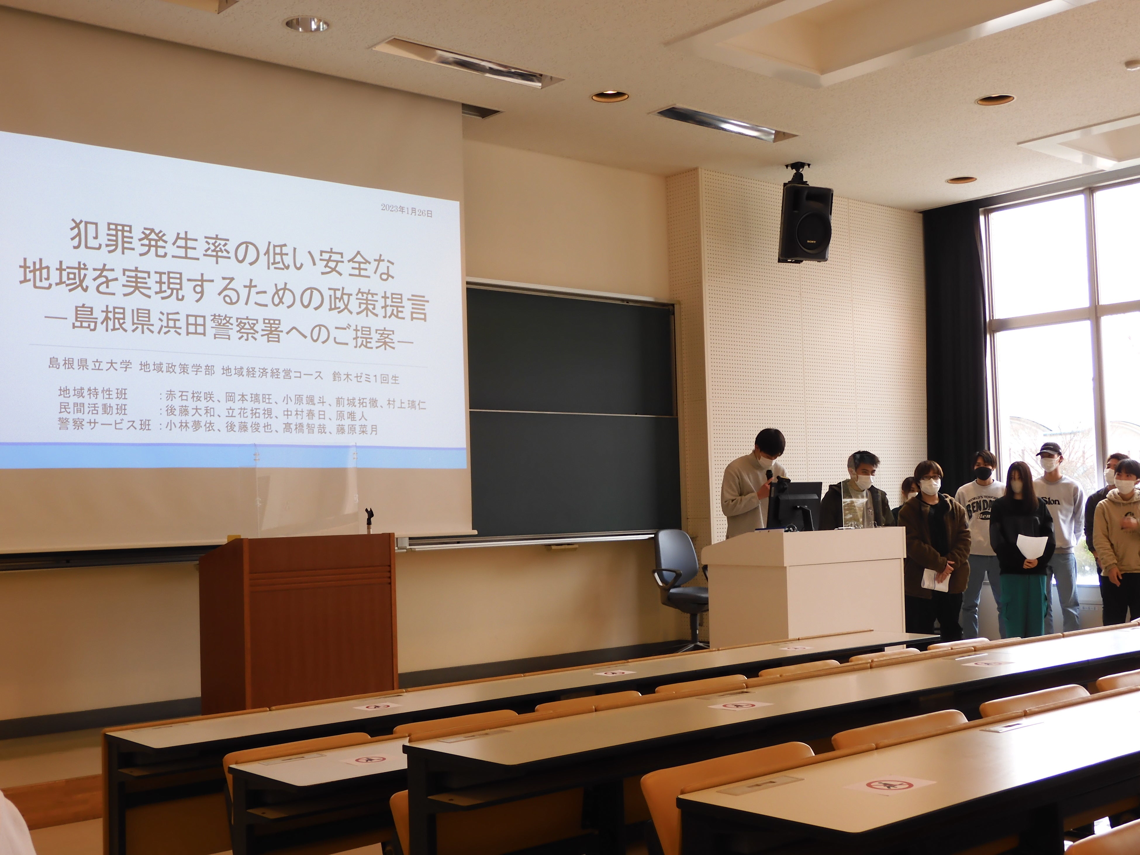 島根県立大学地域政策学部、地域経済経営コースの鈴木ゼミ1回生は「犯罪発生率の低い安全な地域を実現するための政策発表会」を2023年1月26日(木)に開催し、島根県浜田警察署の職員様に対して政策を提案しました。