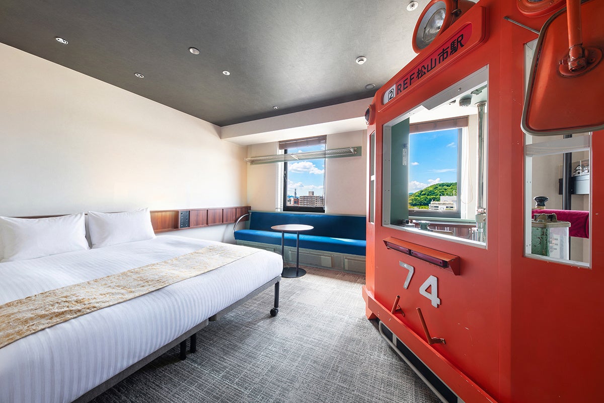 伊予鉄「松山市駅」に隣接した最高のロケーション。ホテルのコンセプトは、「THE STATION」で、鉄道をイメージしたコンセプトルーム「伊予鉄ルーム」を設置し、客室の窓からは、路面電車のレールビューが望め、鉄道ファンはもちろん、幅広いお客様に鉄道の旅気分をお楽しみいただけるようなデザインとなっております。また、館内にはサウナ付き大浴場や貸し切りでゆったり利用できる家族風呂を設け、宿泊のお客様はもちろん、日帰り利用でもご利用いただけるよう、くつろぎの空間をご提供。