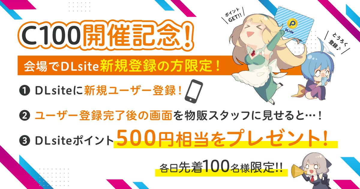 コミックマーケット100当日にDLsiteに新規会員登録をしていただくと、各日先着100名様に500円分のDLsiteポイントカードをプレゼントいたします。