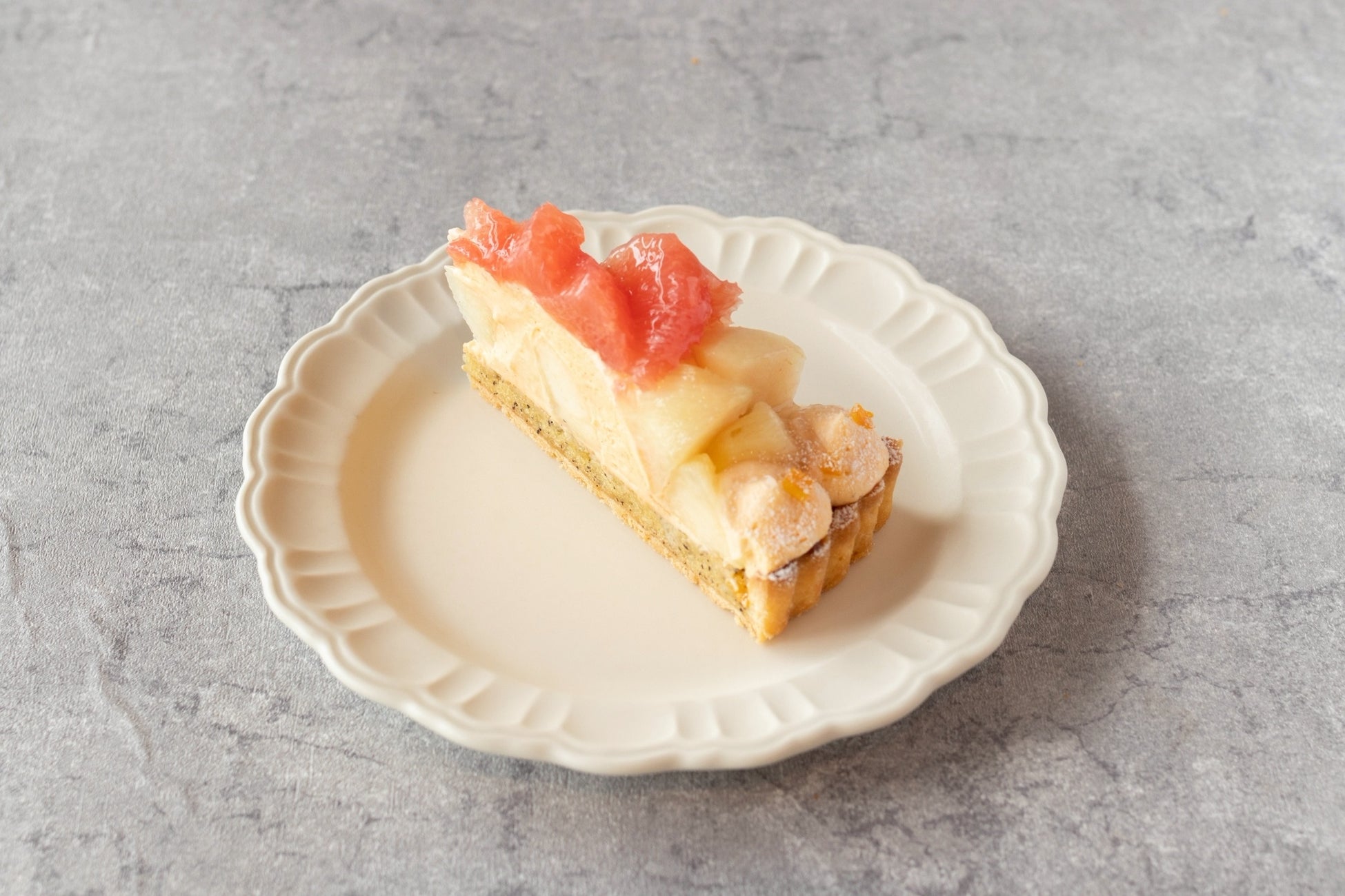 桃のやさしい甘さとルビーグレープフルーツの爽やかな酸味がひとつになった、見た目も味わいも涼しげなタルトです。夏にぴったりの一品です。