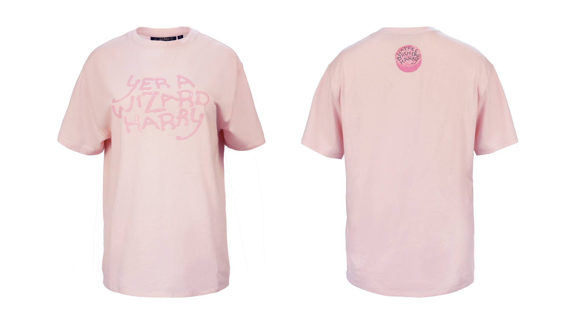 映画『ハリー・ポッターと賢者の石』で、ハグリッドがハリーに初めてバースデーケーキでサプライズする忘れられないシーンにインスパイアされたベビーピンクのTシャツです。フロントには、ケーキのアイシングフォントで「YER A WIZARD, HARRY(お前魔法使いだ)」の文字がプリントされており、あの心温まるシーンが蘇ってくる1枚です。