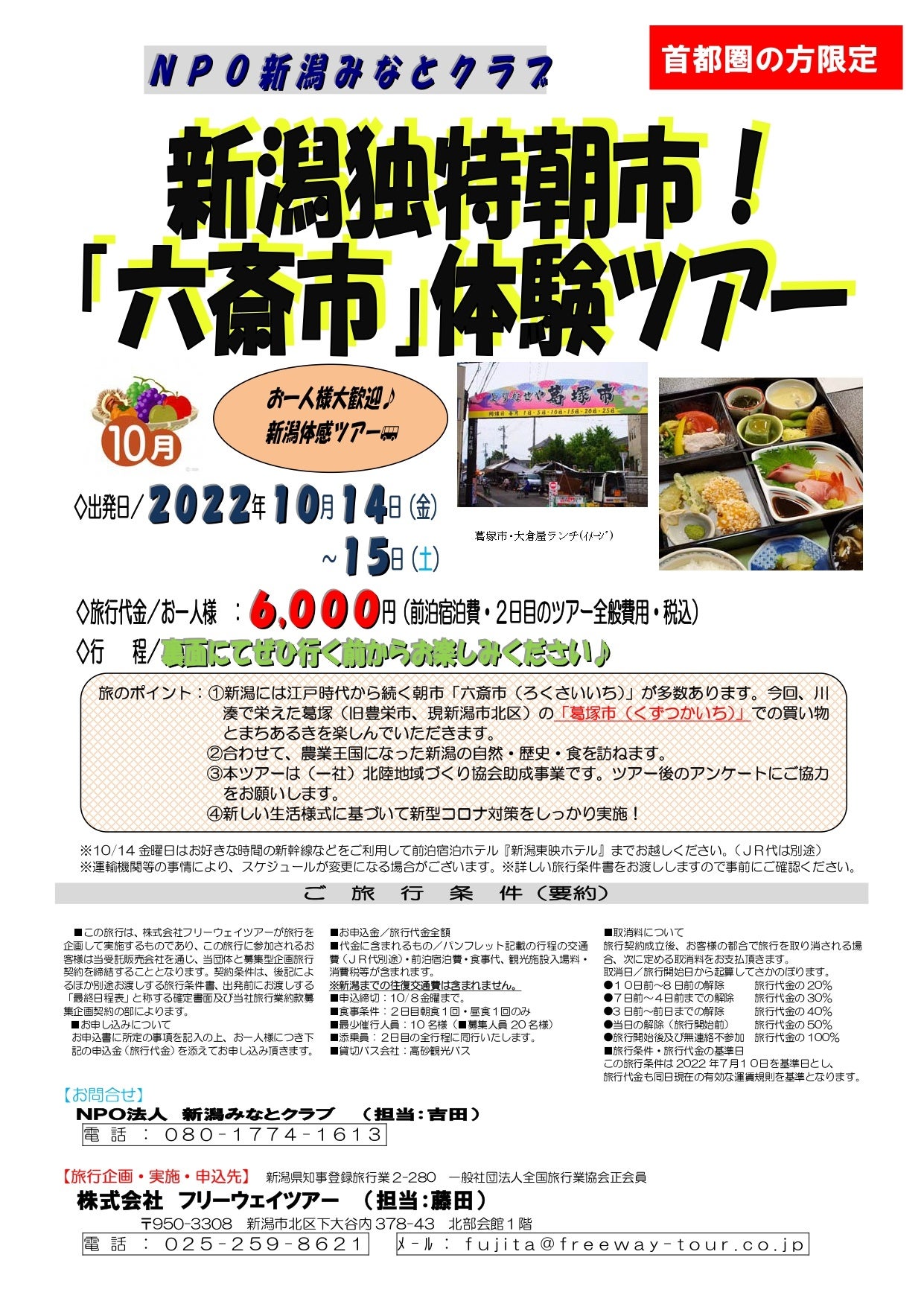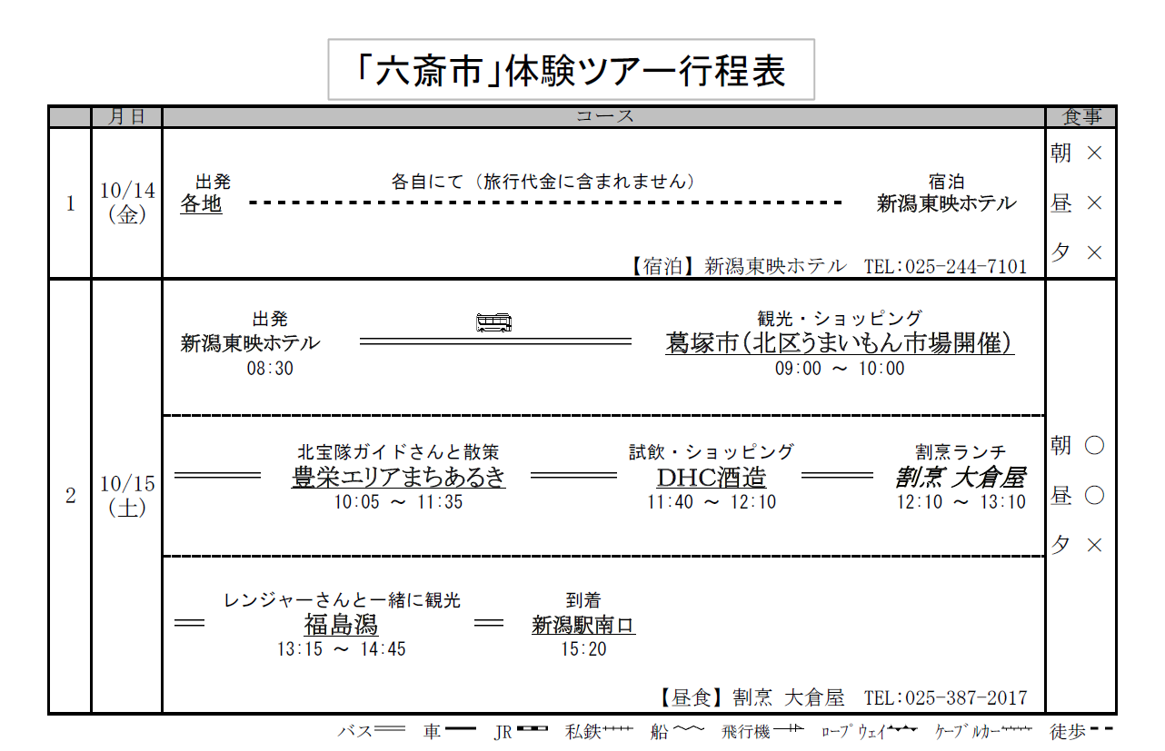 旅行代金:おひとり様6,000円(前泊宿泊費・2日目のツアー全般費用※税込)