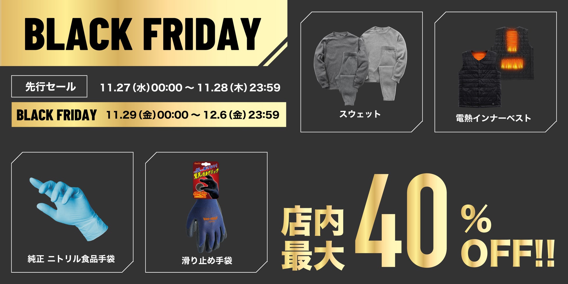 期間限定の目玉商品には、今シーズンAmazonでベストセラーを獲得し、シリーズ累計100万枚突破した「軽くて柔らかい、あったか裏起毛スウェット上下セット」、作業効率を変える便利な「手袋シリーズ」、寒冷地での作業や屋内でも寒さが厳しい状況で大活躍する「電熱インナーベスト」など、Amazonブラックフライデーだけの期間限定でお得な価格でご購入いただけます!