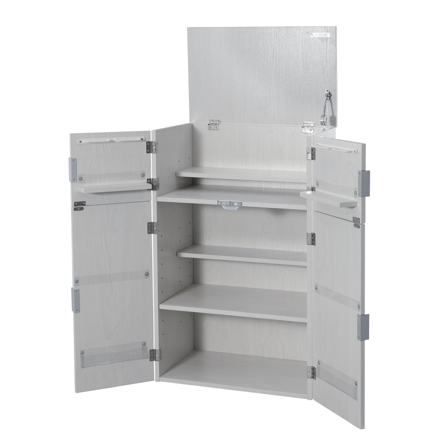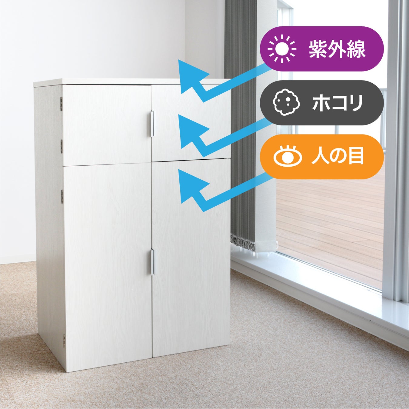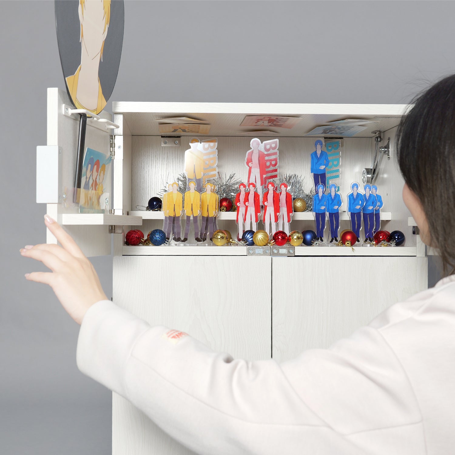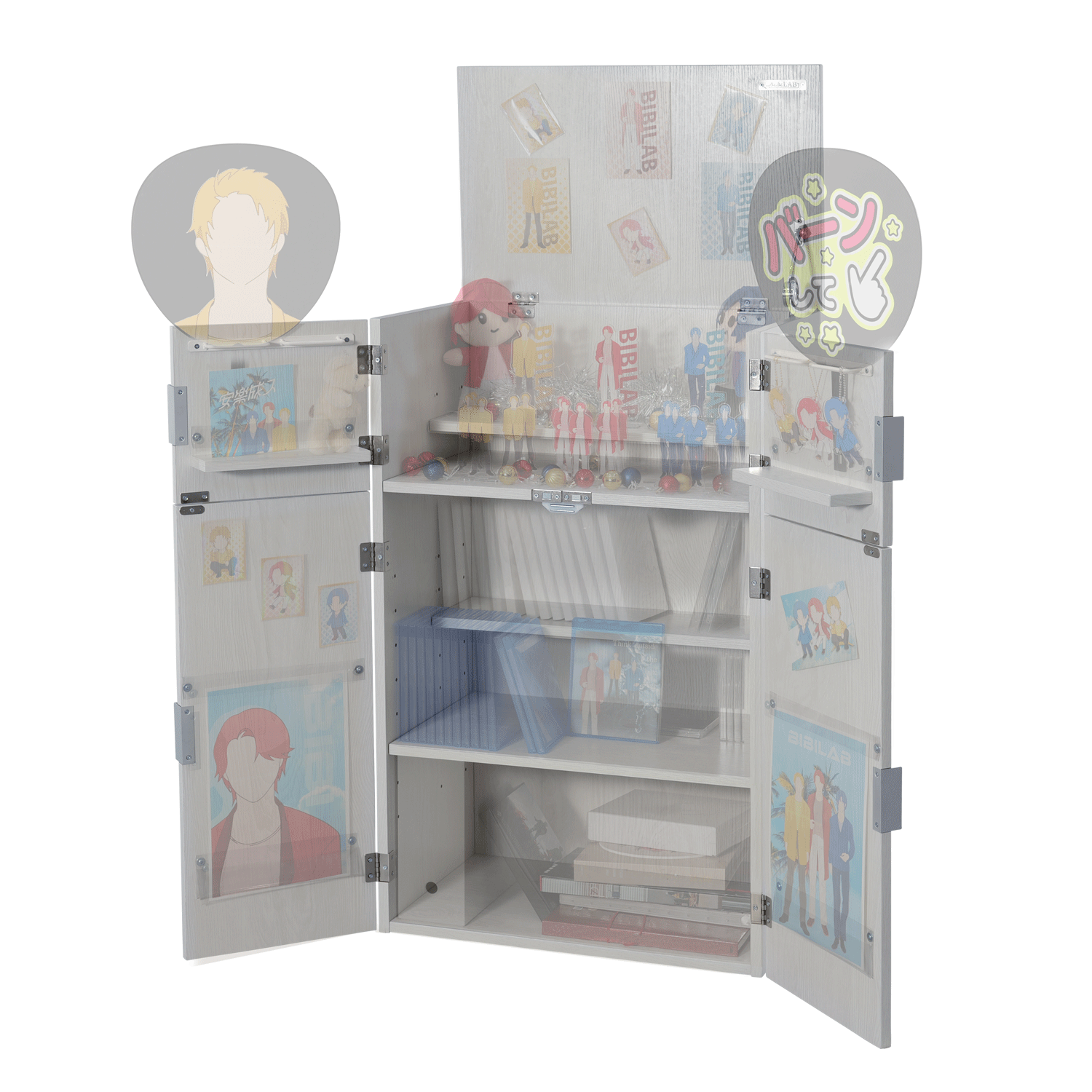 一見すると白の木目調がおしゃれでシンプルな収納棚が、扉を開くと一変!観音開きのフラップに加え、天板も上に開くことができ、まるで小さなステージのような空間が出現します。自由な配置でグッズを飾り付けて、推しを祀り尊ぶことが可能です。扉を閉じれば、サッと目隠しが完了。自分と推しだけの秘密の空間として、ときめきと一緒にグッズを保管しておくことができます。来客/オンライン会議時の推しバレ防止や、紫外線・埃によるダメージから大切なコレクションを守るのにも役立つ、実用性にも優れた"推し棚"です。