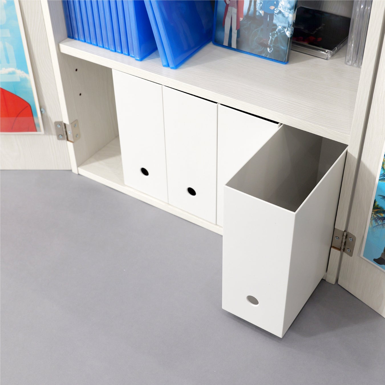 付属の可動棚板は、高さを8段階から選択可能。CD/DVD・雑誌はもちろん、規格外の特装版グッズまで、収納物のサイズにあわせて棚位置を調節できます。市販のA4ファイルケースも内蔵でき、整理しながら保管できるのもうれしいポイント。さらに、下段扉の内側には、クリアファイルホルダーを搭載。つい集めがちながらも使うに使えず仕舞い込んでいたファイル・フライヤーを、気軽に飾って楽しめる仕様です。