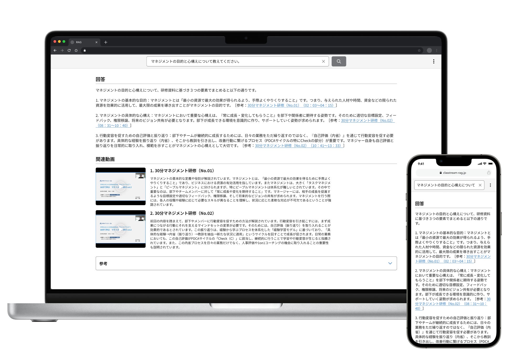 「クラストリーム AI リサーチ」(以下AIリサーチ)は、当社動画配信システム〈クラストリーム〉にRAGを組み込み、社内動画を“検索可能なナレッジ資産”へ変換する国内初のオプションです。ユーザーが自然文で質問すると、AIが