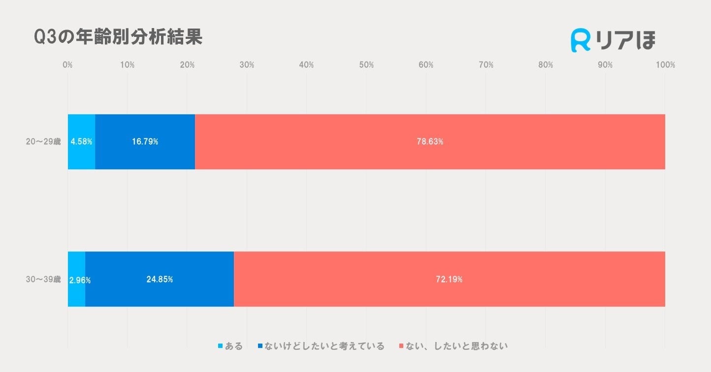 20〜29歳の回答者のうち、4.58%が既に卵子凍結を利用しており、16.79%が「ないけどしたいと考えている」と回答しました。30〜39歳の回答者では、2.96%が既に卵子凍結を利用しており、24.85%が「ないけどしたいと考えている」と回答しました。20代と比較して30代の方が卵子凍結に対する意欲が高いことが示されました。