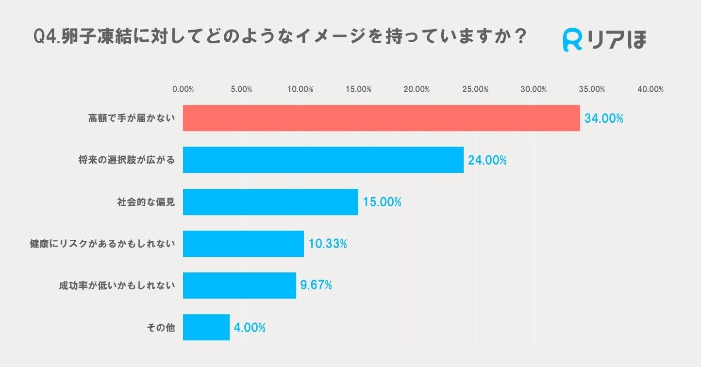 卵子凍結に対する懸念として最も多かったのは「高額で手が届かない」(34.00%)、次いで「将来の選択肢が広がる」(24.00%)でした。また、社会的な偏見や健康リスクについての懸念も見られました。