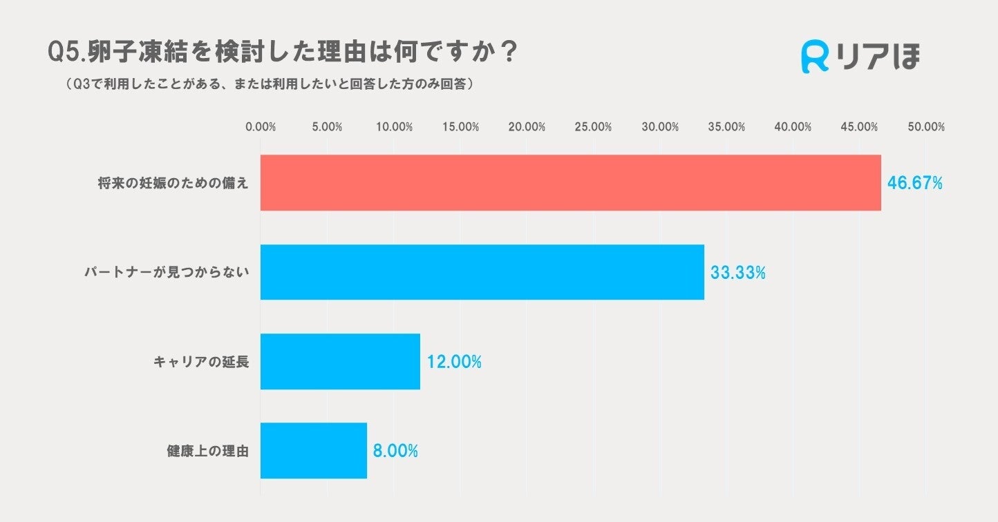卵子凍結を検討する主な理由は「将来の妊娠のための備え」(46.67%)、続いて「パートナーが見つからない」(33.33%)でした。これにより、将来の選択肢を確保するための手段として卵子凍結が重要視されていることが分かりました。