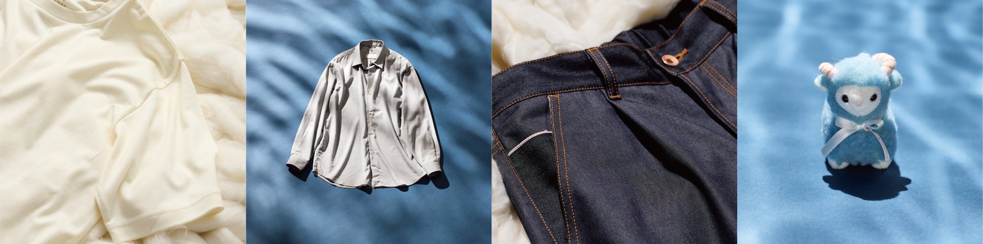 今回のスタイリングは、”エフォートレス”なタウンカジュアルがコンセプト。ウールデニムや、ウールシャツ、ウールTシャツを組み合わせて、春らしい装いをお楽しみいただけます。各商品はその場でご購入いただけます。
