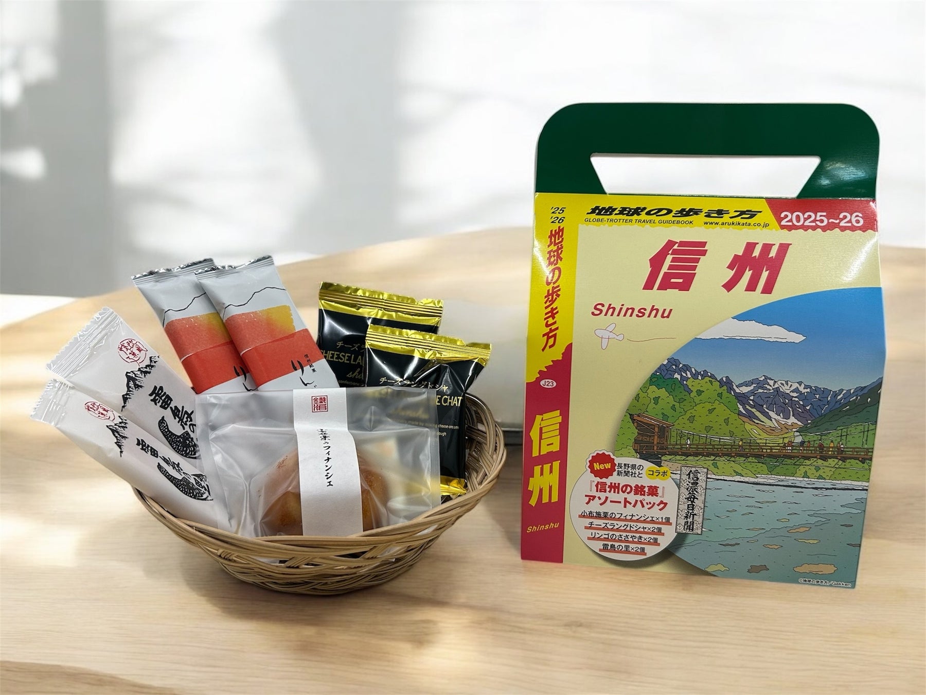 今までありそうでなかった信州の人気銘菓を集めた詰め合わせ商品。「雷鳥の里」(田中屋)、「りんごのささやき」(タカチホ)、「チーズラングドシャ」(軽井沢トルタ)、「小布施栗のフィナンシェ」(井筒屋鐡治)の4商品7個入り。長野県内の菓子製造会社4社の協力によって実現しました。『地球の歩き方 信州』同様のデザインをベースにした、お土産としてそのままお渡しいただける手提げ付きオリジナルボックス入りです。