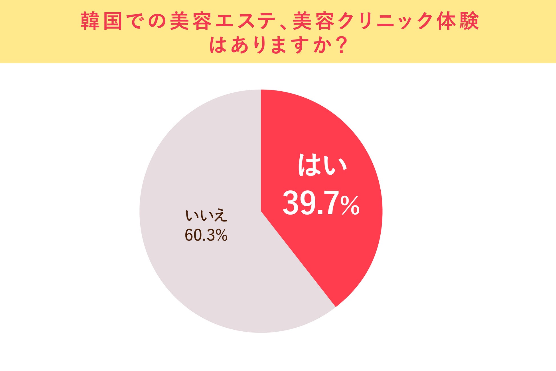 韓国美容エステに「興味がある」と答えた方に対し、「韓国での美容エステ、美容クリニック体験はありますか?」と聞いたところ、「いいえ」は60.3%でした。