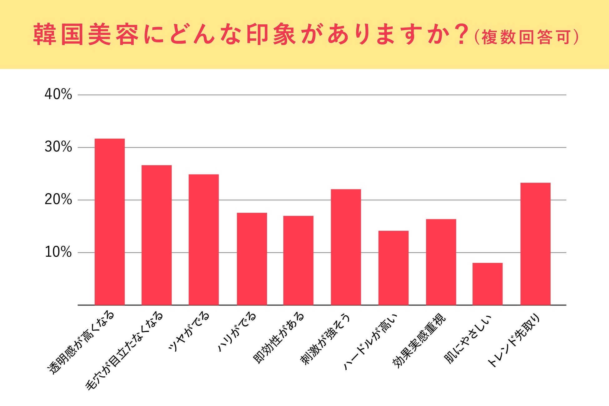 さらに、「韓国美容にどんな印象がありますか」という設問では、「透明感が高くなる」が31.8%で最多となり、次いで「毛穴が目立たなくなる」が26.7%、「ツヤがでる」が25.0%、「トレンド先取り」が23.3%という結果でした。