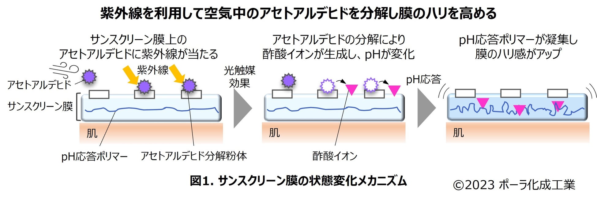 サンスクリーン製剤を使う際の日中の環境変化として、「紫外線」に着目しました。ポーラ化成では、紫外線を利用し大気汚染ガスであるアセトアルデヒドを分解する製剤技術(※1)を有しています。この技術では、アセトアルデヒドが分解される時に酢酸イオンが生まれます。これは膜のpHが酸性側に傾くことを意味しています。そこで、このpH変化を利用して膜の張力につなげられないかと考えました。