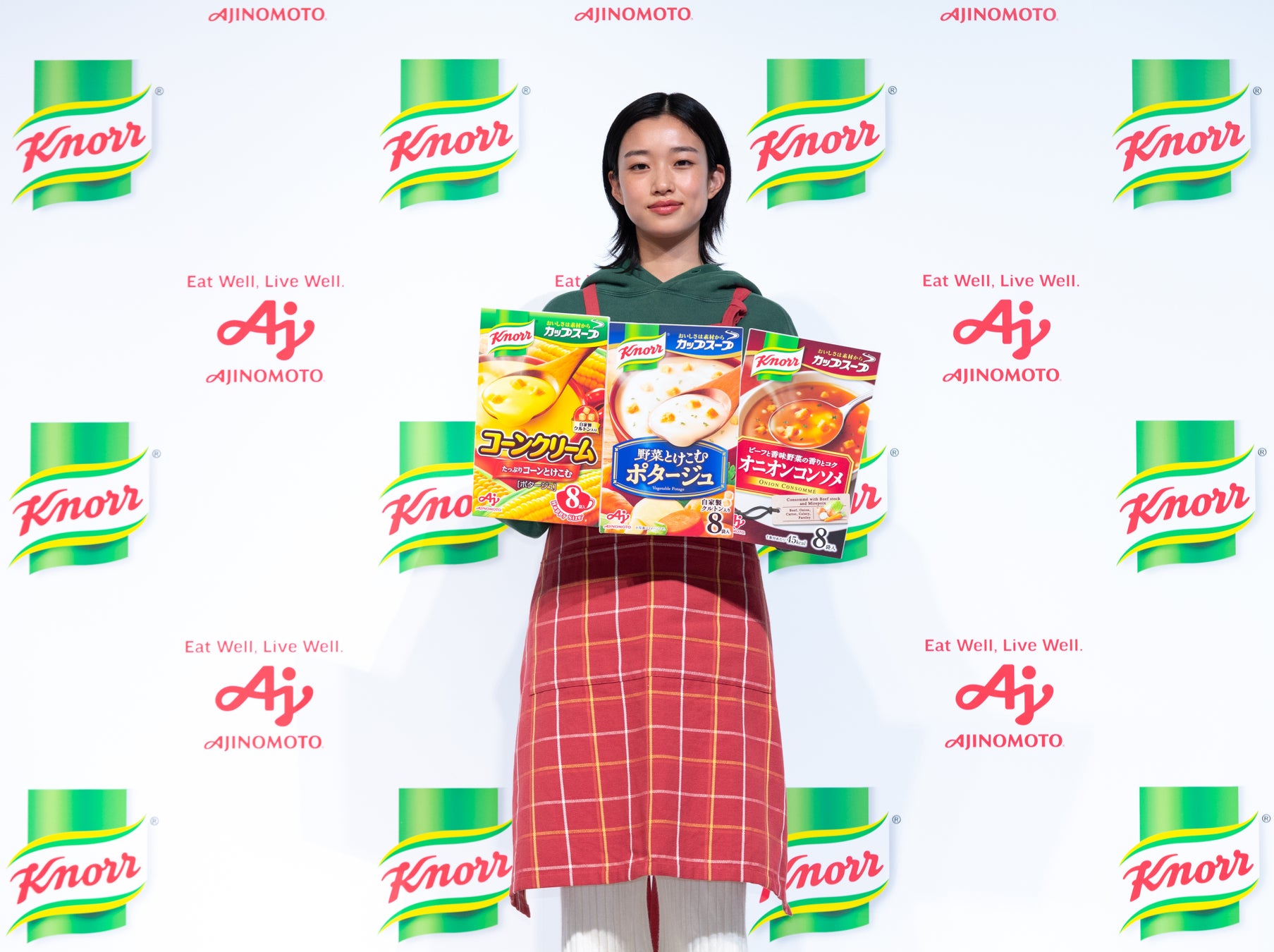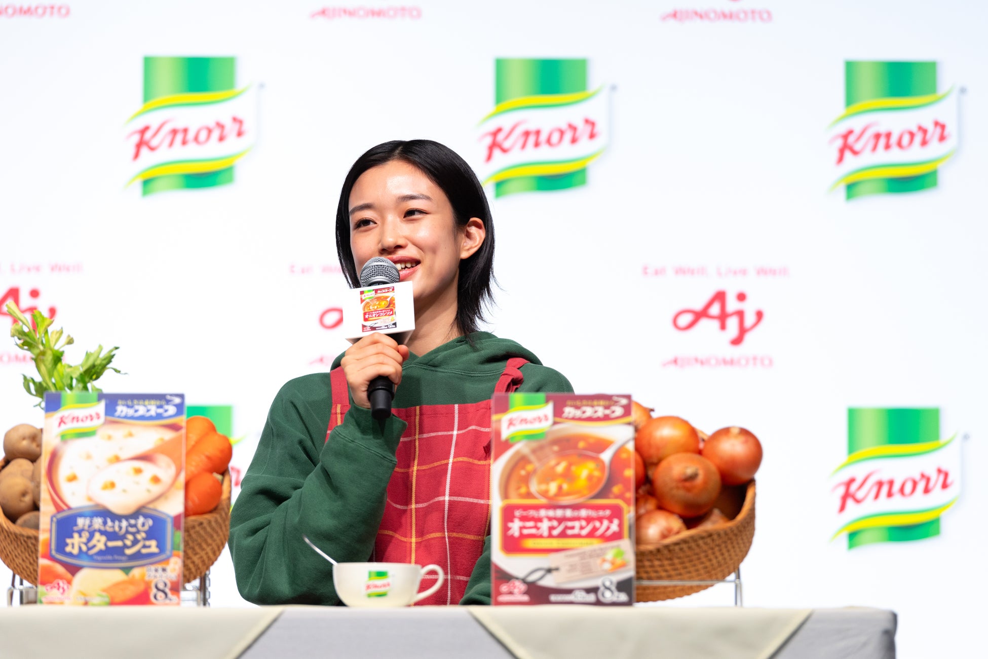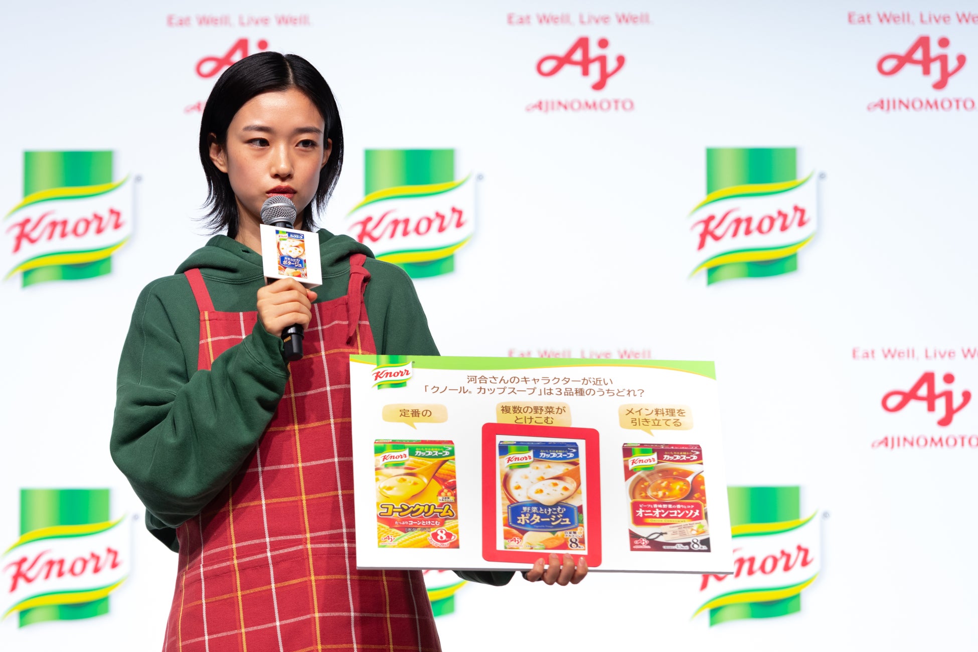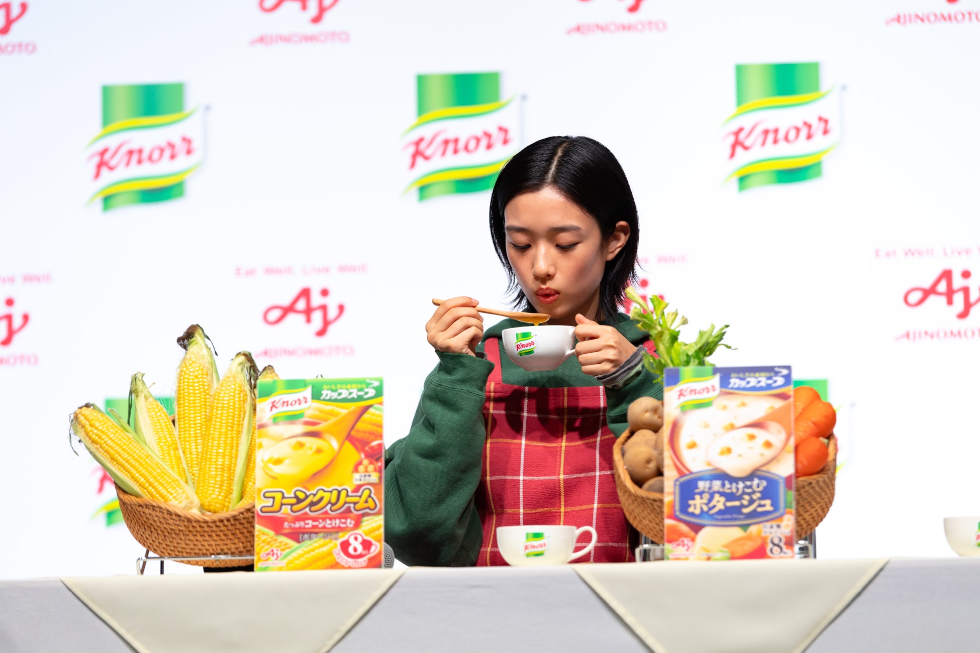 <味の素㈱「クノール® カップスープ」新CM発表会>21代目CMキャラクター・河合優実さんが登場!“日常のシチュエーション”を思い浮かべながらコーンクリーム・ポタージュ・オニオンコンソメの3品種を実食