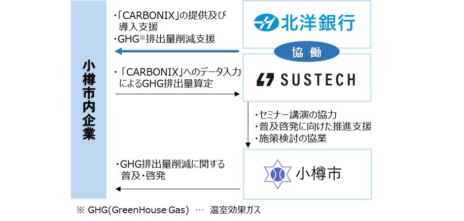 本協定書に基づき、サステナビリティ方針に基づき、すべてのステークホルダーの皆さまと地域社会と環境の持続的発展の貢献に取り組む北洋銀行のネットワークとSustechの脱炭素化支援のノウハウを活用した協業により、2050年までに二酸化炭素排出量の実質ゼロを目指す、「ゼロカーボンシティ小樽市」の市域企業の温室効果ガス排出量の可視化を契機とした小樽市域内企業の脱炭素化に貢献してまいります。