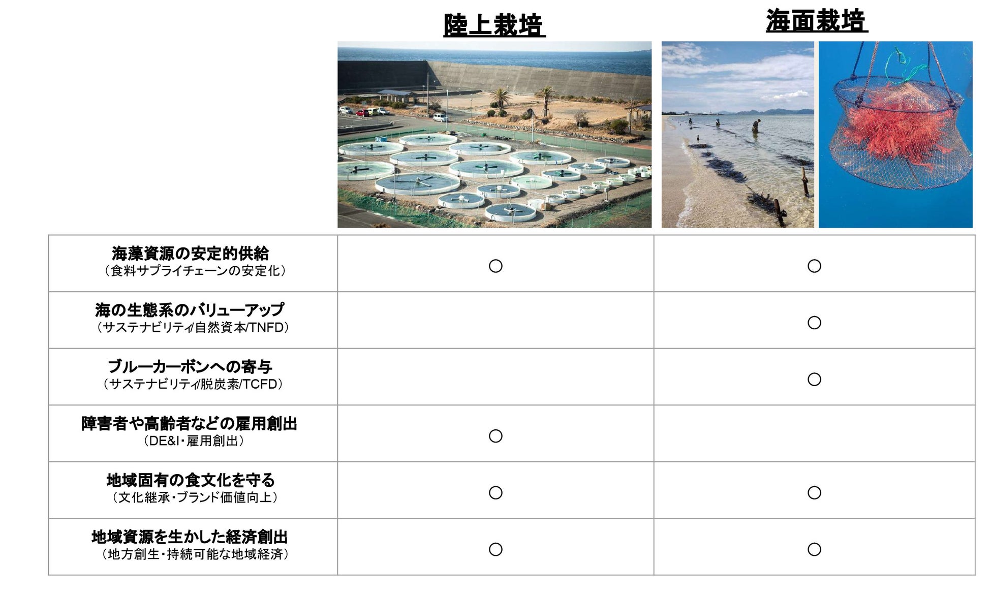 本実証実験では、各海域において適した海藻の選定から量産に向けた試験を通じて、それぞれの海藻の生産に関する各種データや、事業化の検討に必要な情報の整理等を行い、地域パートナーと協議しながら継続的な事業展開の可否を検討していきます。全国の自治体で「養殖藻場*」や「陸上栽培」による海藻生産の社会実装を目指しています。