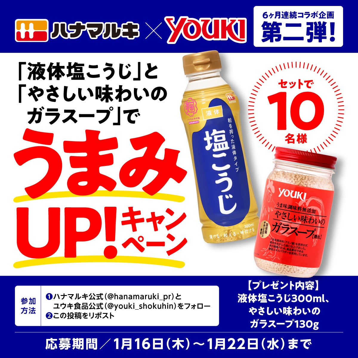 <ハナマルキ × ユウキ食品 コラボレーション企画>「液体塩こうじ 」×「やさしい味わいのガラスープ」1月16日(木) より、コラボレシピ公開&ハナマルキ公式Xにてプレゼントキャンペーン開始!