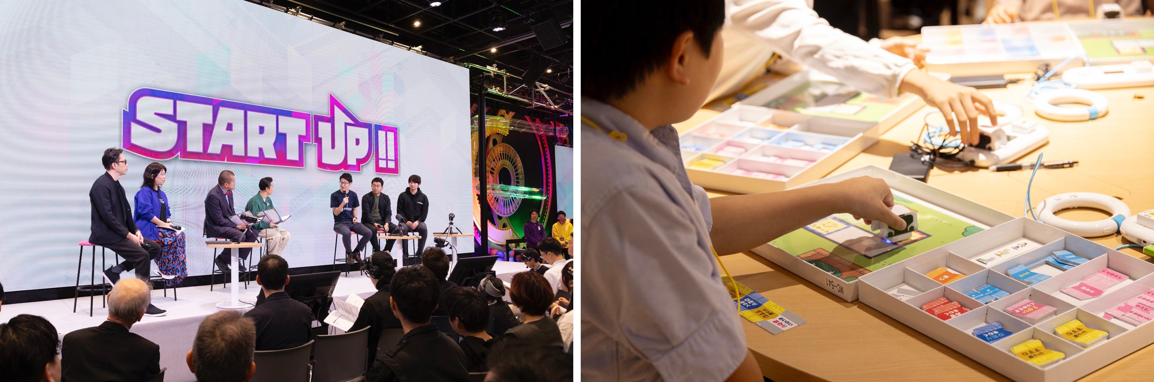 11月2日(土)は、子どもから大人まで楽しんでもらえるコンテンツをご用意。ノーベル賞受賞者の吉野氏や2023年に作家業を引退された鈴木おさむ氏にセッショントークをしていただきました(鈴木氏は雨天の影響により急遽リモート出演で実施)。また、東海テレビ「START UP!!」が公開収録を行い、MCを務めるお笑い芸人のカミナリと東海地方から世界を目指す多数の起業家たちによるステージで、お客さんを盛り上げてくれました。その他にも、ARやAIを使用したデジタル体験コンテンツやプログラミング体験教室を行い、小さなお子さんもたくさん参加していただけました。