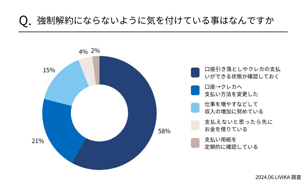 強制解約になった事がある方へ、今後強制解約にならないように気を付けている事を伺ったところ、「事前に口座やクレジットカードで引き落としができるか確認しておく」が最多の58%という結果でした。