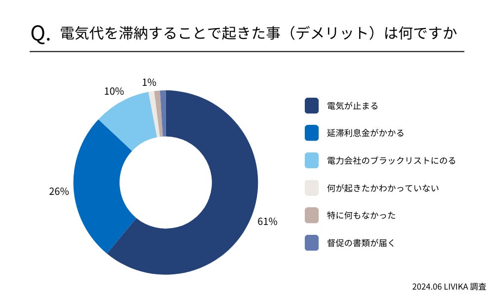 電気代を滞納するとどのようなデメリットがあるかアンケートを取ったところ、一番多い回答は「電気が止まる」で61%という結果でした。