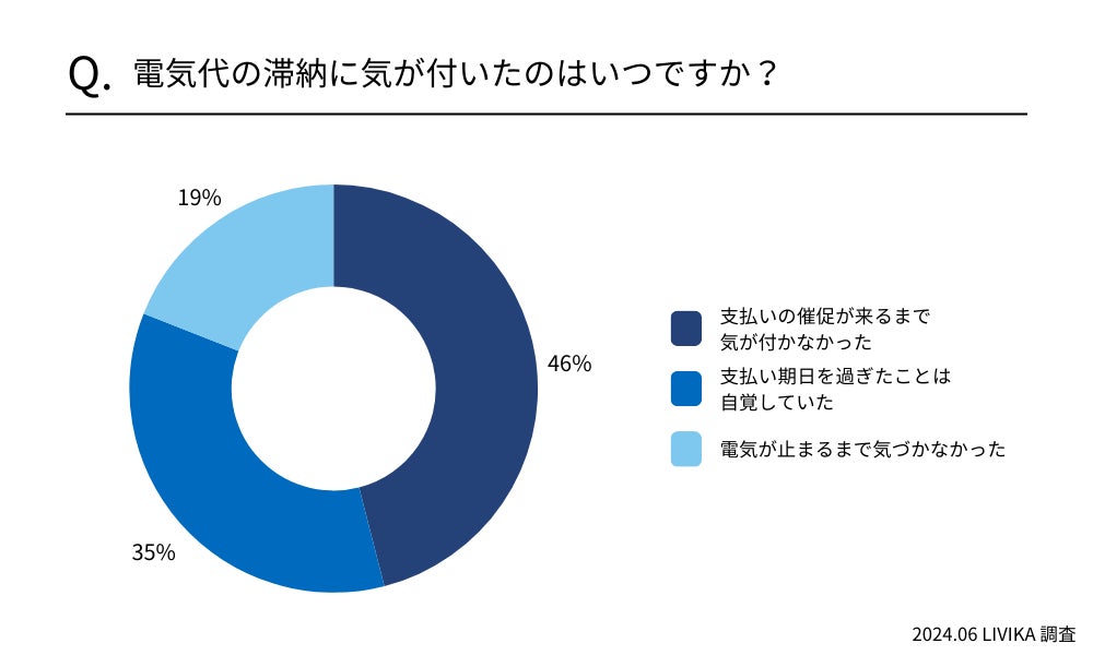 どのタイミングで電気代を滞納している事に気づいたかを調査したところ、「支払の督促が来るまで気づかなかった」と回答した人が46%でした。