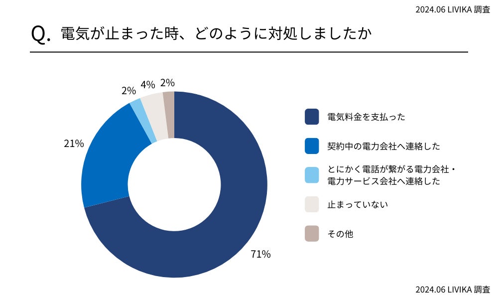 地域電力で送電停止になった時どのように対処したか調査したところ、一番多かった回答は「電気料金を支払った」で71%でした。