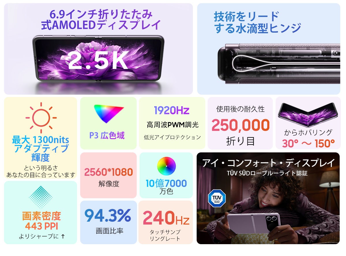 ディスプレイ | 6.9インチ AMOLED 折りたたみディスプレイ ※円形サブディスプレイ搭載 解像度:2560×1080(FHD+) ピーク輝度:1,300nits |